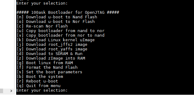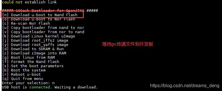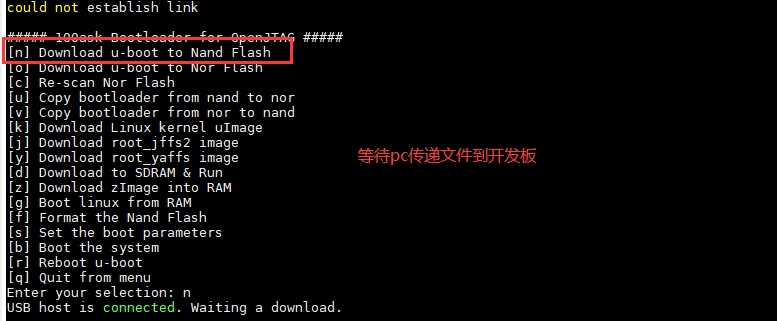 n 表示 接收 usb 文件 并烧 写到 nand flash, 如果看不到这个菜单,输入menu