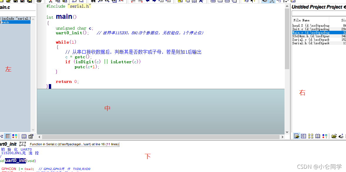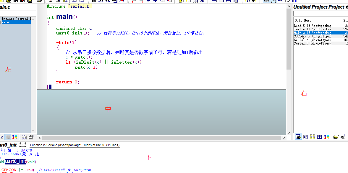 下 上下文窗口: 光标放在主窗口的某一个函数上(变量、宏定义上) ,在 下面窗口可以看到相应的定义