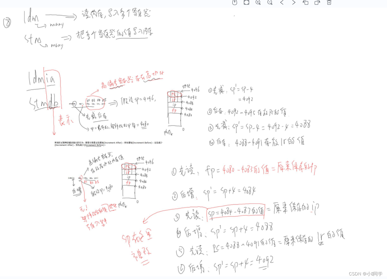 stmdb sp!,{fp,ip,lr,pc}先减后存(存高地址) , 比如此时sp指向 4096, 首先sp-4 , 存高地址,pc=r15, pc存进去ldmia ldmia sp,{fp,sp,pc} 首先读取后增加首先读取sp指向的栈地址内容fp, sp=sp+4 移动sp , 出栈! 含义: