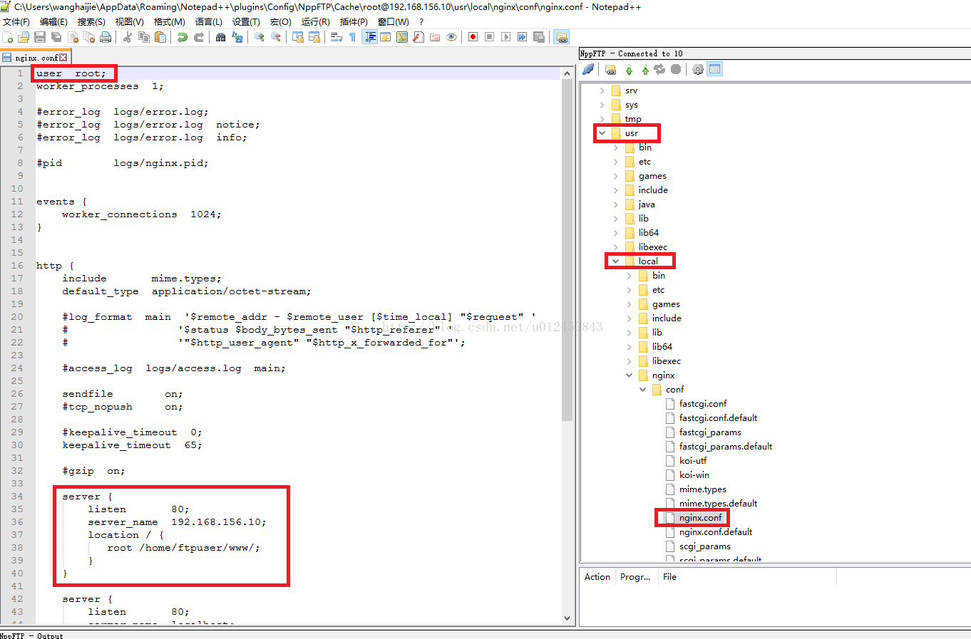 我们可以使用Nodepad++连接我们的服务器(这里我用的是虚拟机)找到对应的nginx.conf文件,如下图所示,在配置文件中我们只需做两处改动,大家不知道怎样用Nodepad++的话,可以参考:http://blog.csdn.net/u012453843/article/details/52987666这篇博客。