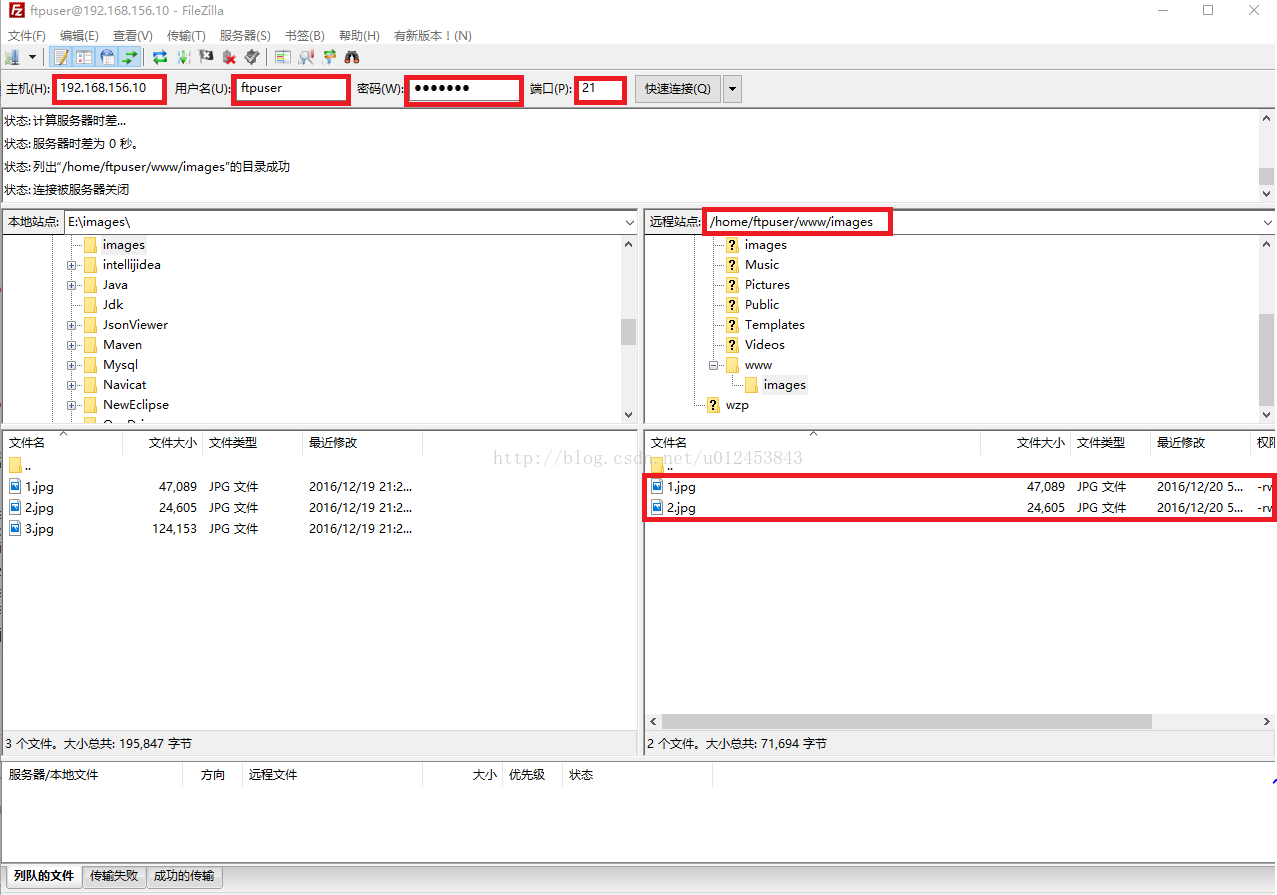 下面我们来试试我们的图片服务器是否成功,我们像图片服务器的相应目录下放几张图片,这里我用的工具是FileZilla,如下图所示。我上传了两张照片,分别是1.jpg和2.jpg