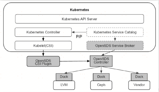 如图4所示,OpenSDS社区提供了专门的OpenSDS CSI(Container Storage Interface)Plugin与Kubernetes集成,同时在Kubernetes内部还开发了特定的OpenSDS Service Broker,来负责在不改变代码的情况下暴露OpenSDS的高级特性(比如replication、migration、data protection等)给Kubernetes。