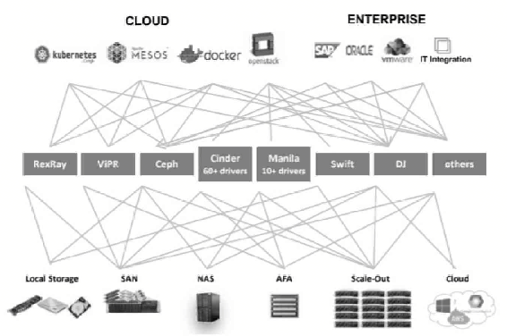 也就是说,用户如果准备把业务迁移到云上,首先要挑选一个云计算平台,然后挑选一个存储控制器,还要挑选一个符合自身业务特性的存储后端。由此可见用户需要做多项选择,这个图并不是每个用户都需要在上面做全连接,其实对于任何一个用户即便是从三层里面每一层挑一个出来,如果想达到一个最好的选择,都是一件非常困难的事情。