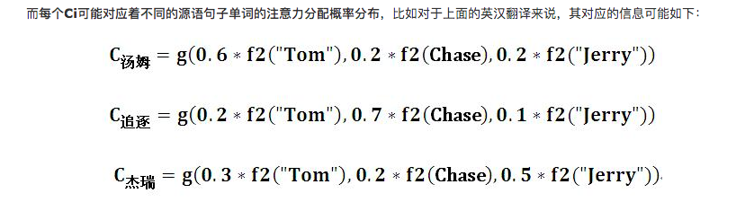 f2(“Tom”),f2(“Chase”),f2(“Jerry”)就是对应的隐藏层的值h(“Tom”),h(“Chase”),h(“Jerry”)。g函数就是加权求和。αi表示权值分布。因此Ci的公式就可以写成: