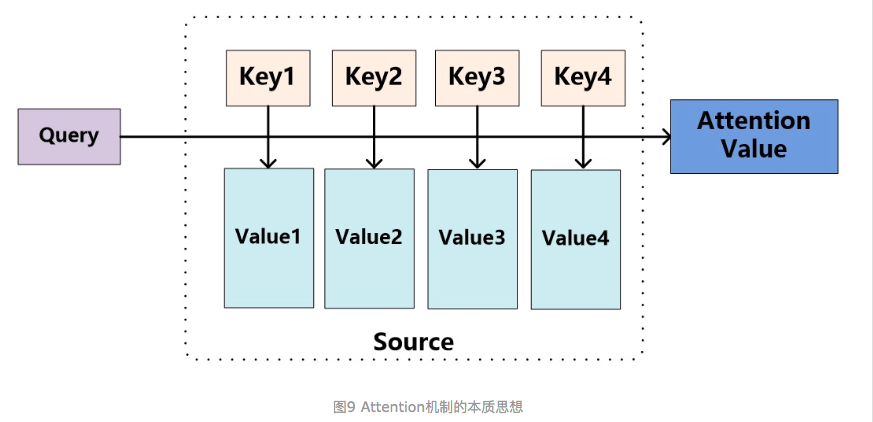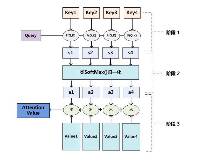 通过如上三个阶段的计算,即可求出针对Query的Attention数值,目前绝大多数的注意力机制计算方法都符合上述的三阶段计算过程。