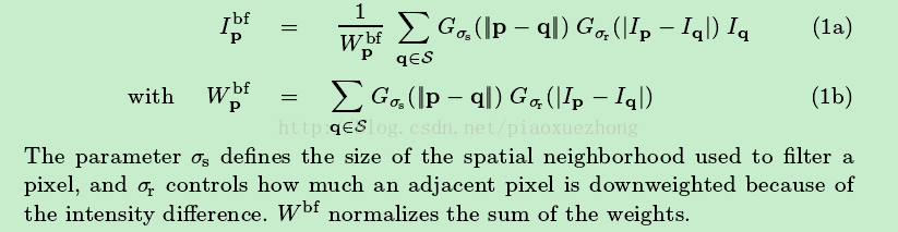 双边滤波是一种非线性滤波器,它可以达到保持边缘、降噪平滑的效果。和其他滤波原理一样,双边滤波也是采用加权平均的方法,用周边像素亮度值的加权平均代表某个像素的强度,所用的加权平均基于高斯分布[1]。最重要的是,双边滤波的权重不仅考虑了像素的欧氏距离(如普通的高斯低通滤波,只考虑了位置对中心像素的影响),还考虑了像素范围域中的辐射差异(例如卷积核中像素与中心像素之间相似程度、颜色强度,深度距离等),在计算中心像素的时候同时考虑这两个权重。 公式1a,1b给出了双边滤过的操作,Iq为输入图像,Ipbf为滤波后图像:
