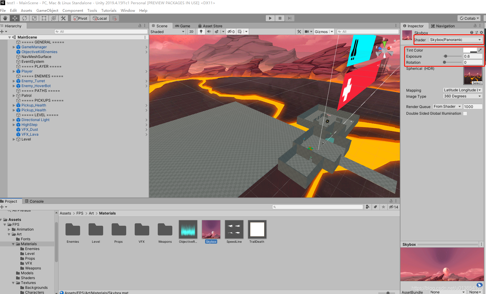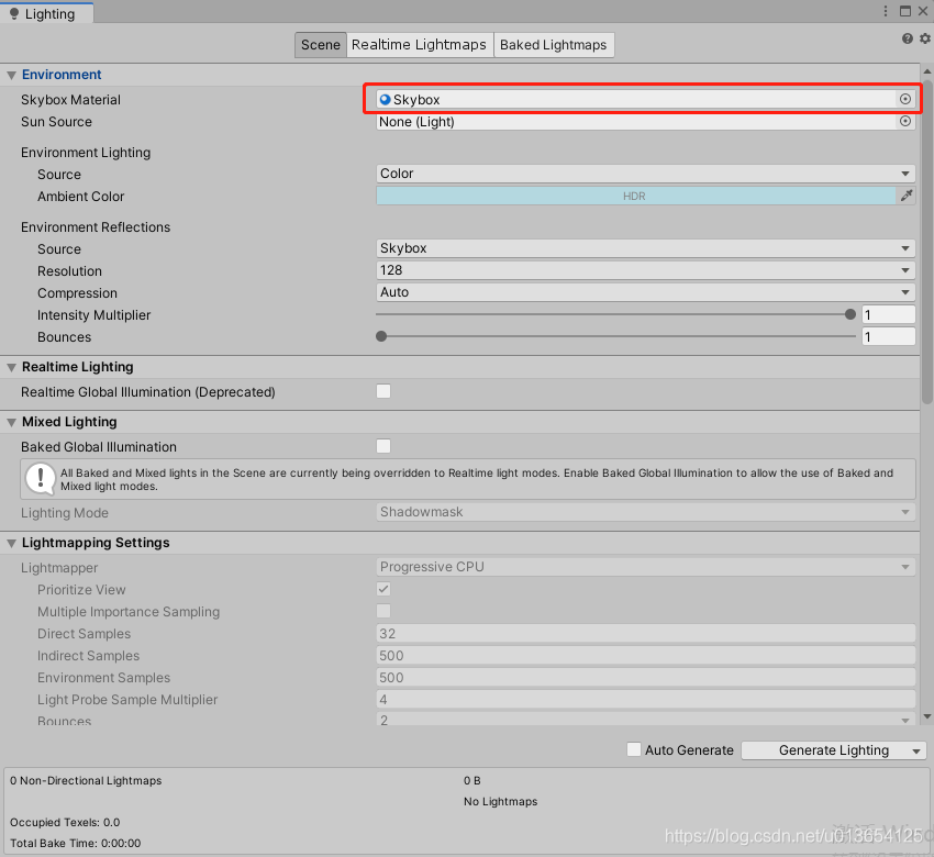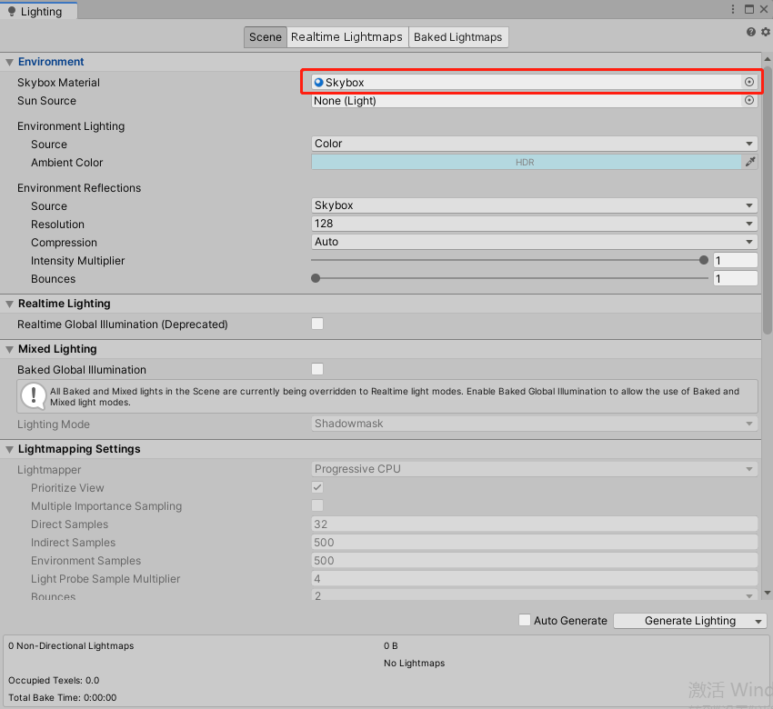 在Window->Rendering->Lighting Settings中,打开Light页面,将Skybox.mat拖拽到Light面板中的Skybox Material中。