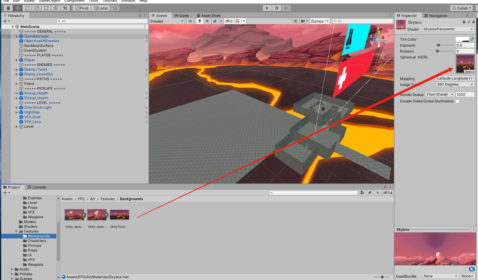 在Project面板中,找到我们的纹理图片,将图片拖拽到Skybox材质的Spherical(HDR)属性上。