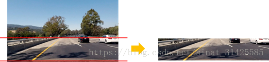 第二步,对图像进行截取,由于获取到的图像中一半为天空及背景:基于这个先验知识,预先对图像进行截取,可以为后面更准确定位车道线奠定基础。