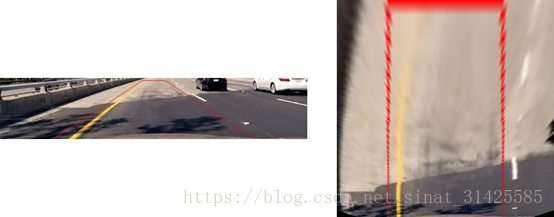 第四步,使用仿射变换,将二值图像转换成鸟瞰图(感觉就是从上往下看的俯视图),这样做是为了将图像进行拉伸,方便后面的滑窗多项式拟合来对车道线进行精确定位: