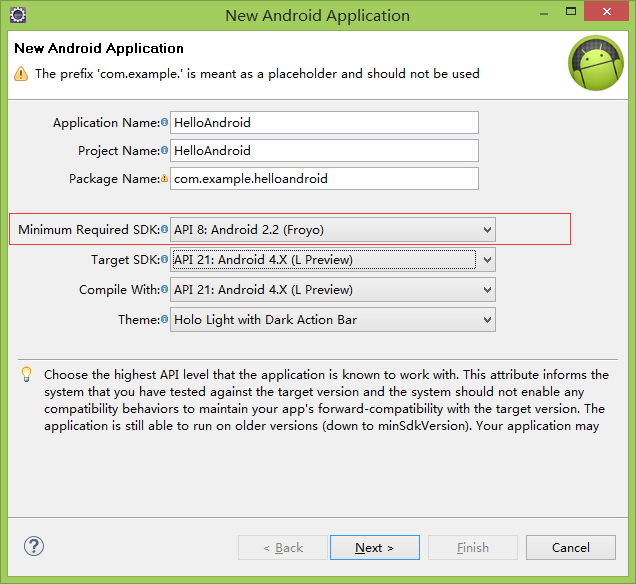 - Minimum Required SDK:最低支持SDK,一般默认的是8,即使应用根本不会在那么低的Android版本上运行;