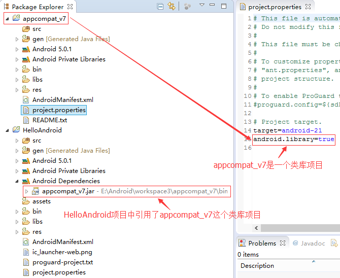 appcompat_v7是作为一个类库项目存在的,本身不能单独运行,而HelloAndroid项目则引用了appcompat_v7项目,继而可以使用appcompat_v7编写好的类库,如下图所示:
