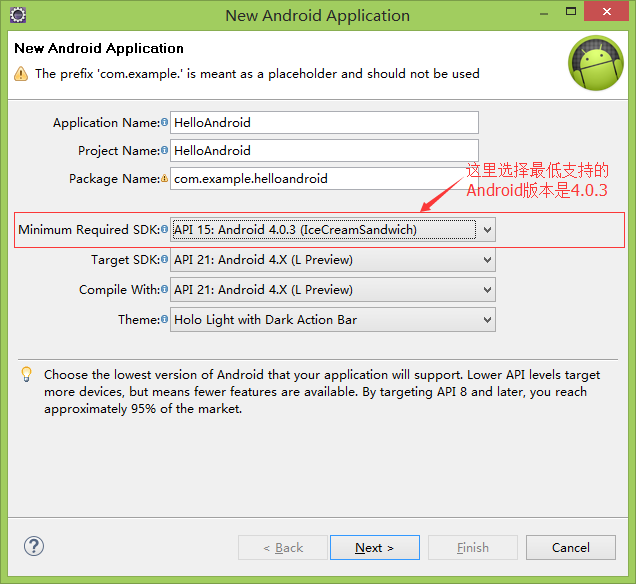 创建项目时选择Minimum Required SDK是API:15 Android 4.0.3,如下图所示: