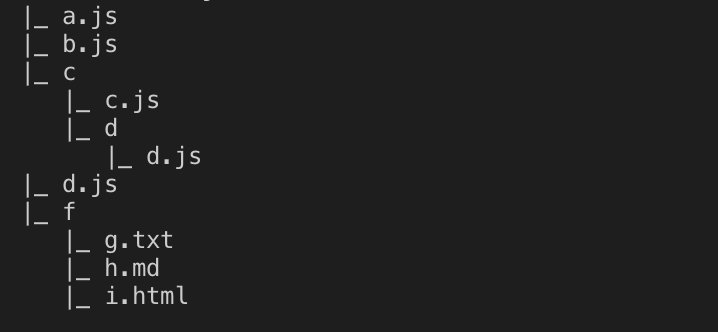 function treeFolder(path, flag = '|_') {var files = [];if(fs.existsSync(path)) {files = fs.readdirSync(path);files.forEach(function(file,index){var curPath = path + "/" + file;if(fs.statSync(curPath).isDirectory()) { // recurse// obj[file] = treeFolder(curPath, {});console.log(flag, file)treeFolder(curPath, ' ' + flag)} else {// obj['--'] = fileconsole.log(flag, file)}})// return obj}
