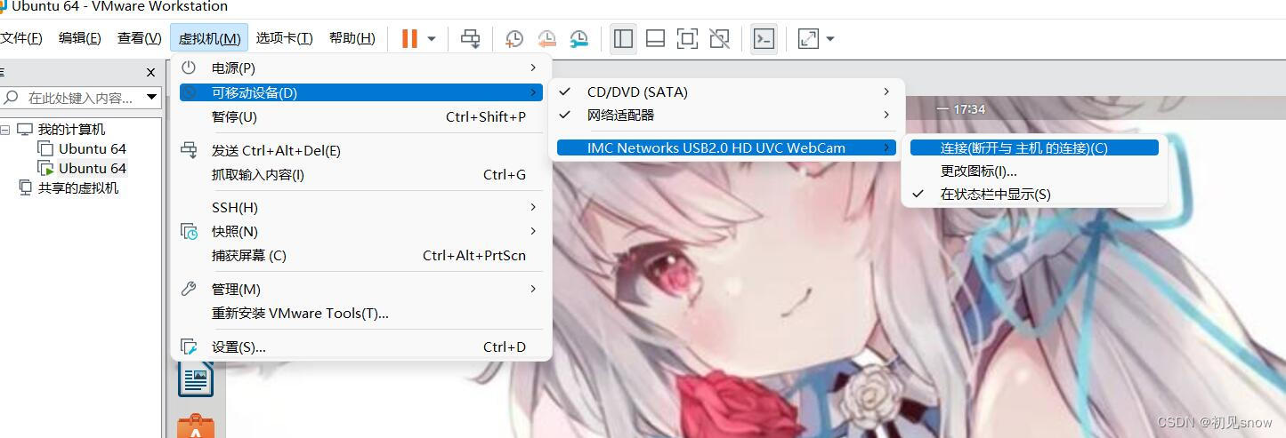 再点击“虚拟机”,选择“可移动设备”,再选择“IMC Networks USB2.0 VGA UVC WebCam”,最后点击连接,在弹出来的窗口点击确定即可。