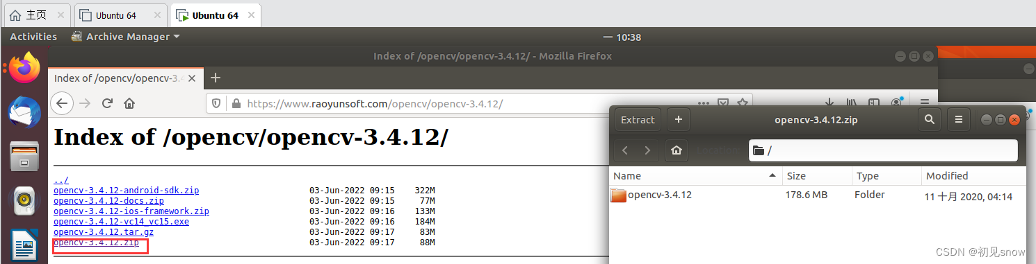 注:可以直接在虚拟机中使用浏览器(Firefox Web Browser)进行下载,(也可以在国外官网地址下载:Releases · opencv/opencv · GitHub,不推荐在国外网址上下载,很慢)。