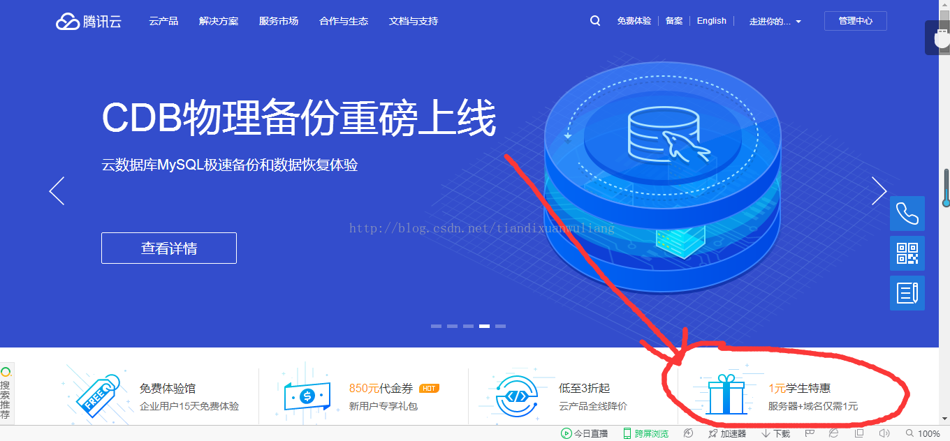 作为一个大学生,且作为一个编程者,拥有一个自己的服务器会对我们的学习带来极大的方便。而且很多服务器公司都对我们大学生有很大的优惠,毕业了就无法享受了,还等什么呢?腾讯云一个月只要1元,本文将利用“腾讯云”搭建一个服务器。