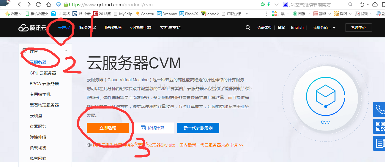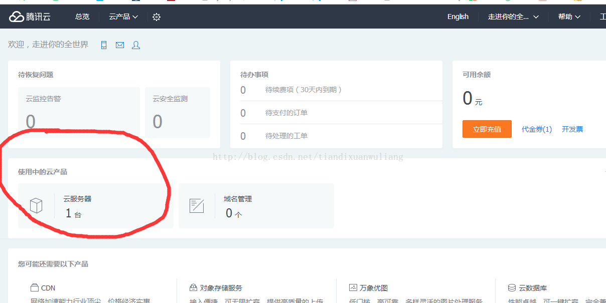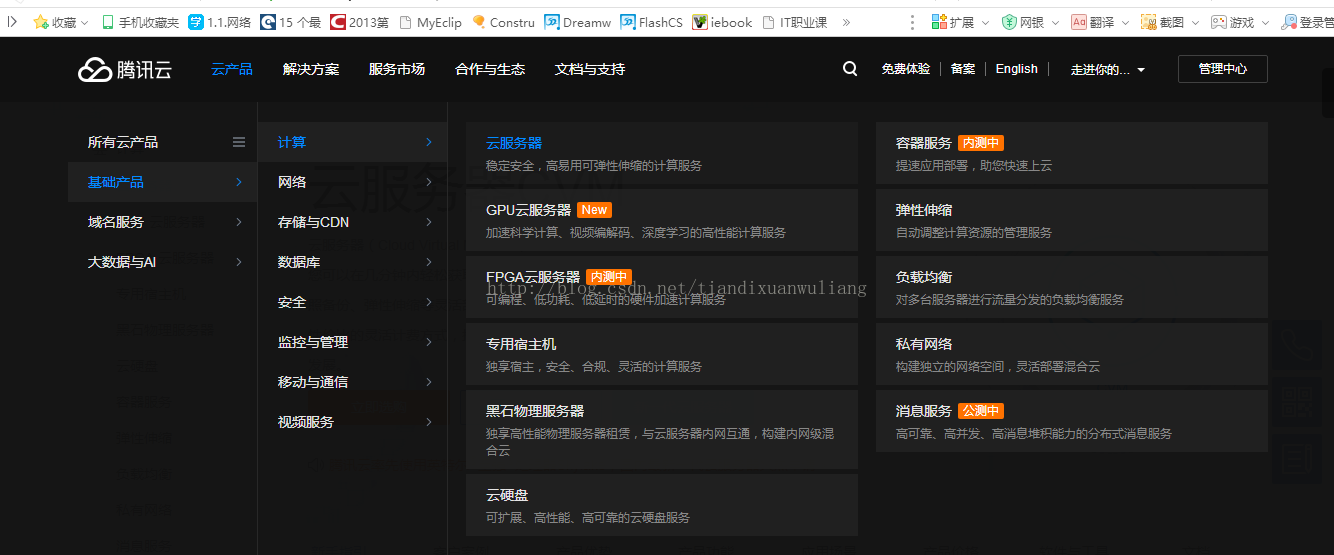 点击“首页”的“云产品”---“基础产品”---“计算”,在点击“云服务器”,如下图: