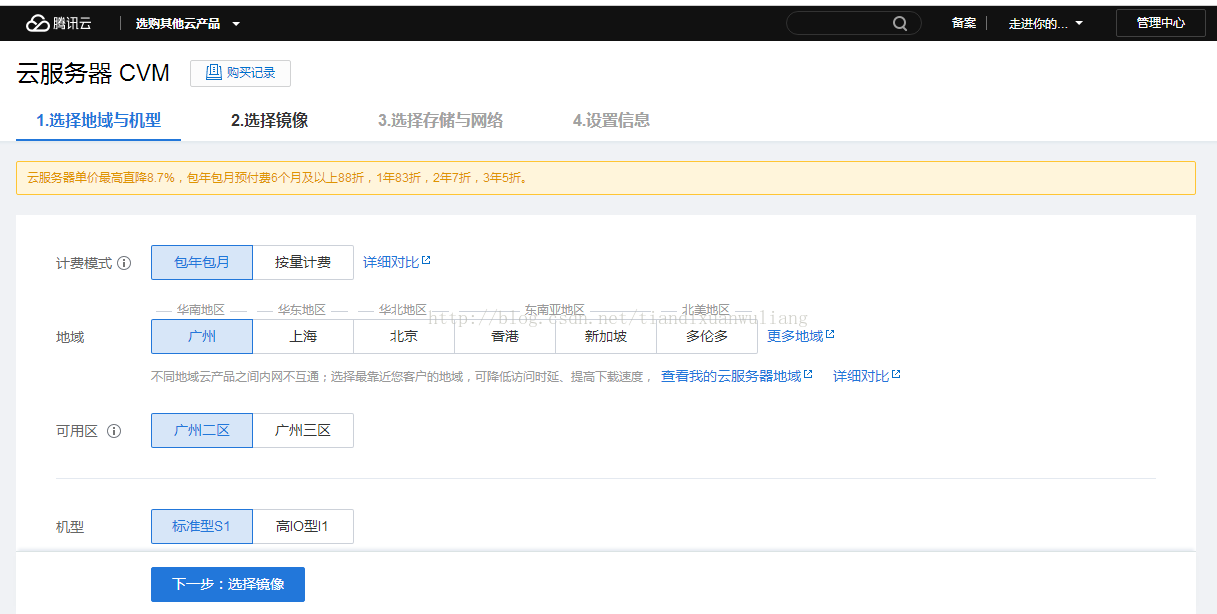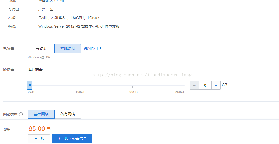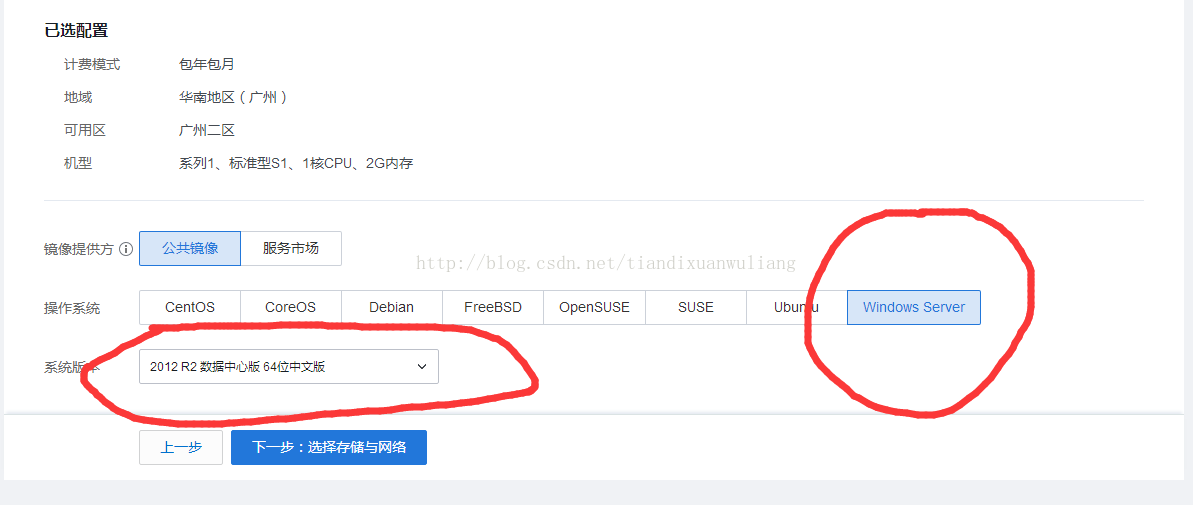 服务器配置中的选择“标准型----1核---1G内存 45元起”的,其他都采用默认。进入下一步,如下图,在此我选择的是Windows系统,用户可以选择其他系统: