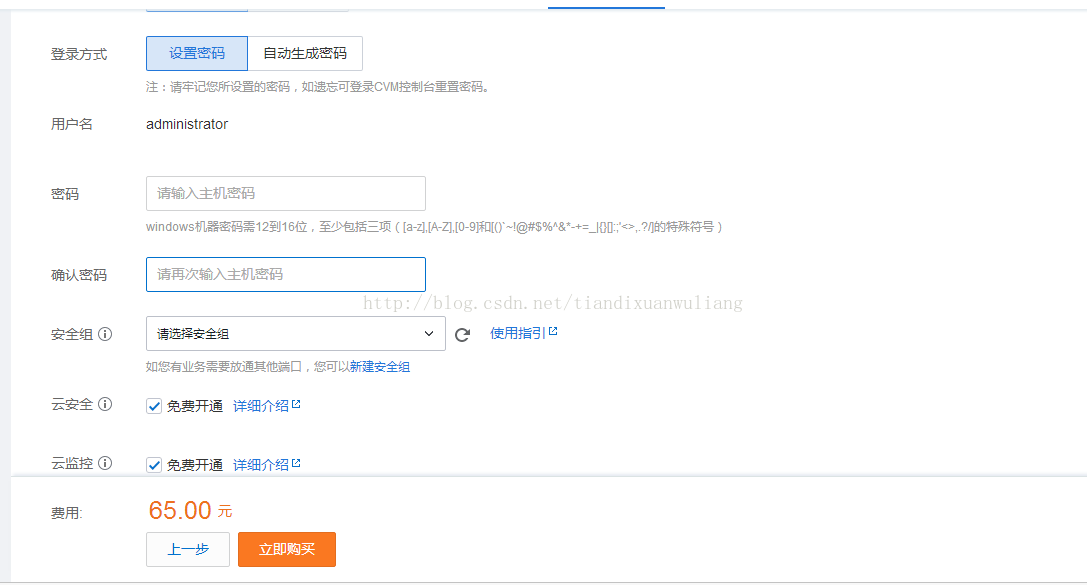 输入服务器登陆密码后,选择“立即购买”,支付“1元”钱,(原价65,学生优惠券64,所以只需要支付1元),完成服务器的配置工作。 - 如何访问服务器: