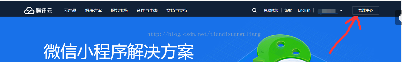 在自己的本机按“Win+R”键,再输入mstsc,打开远程桌面连接。在腾讯云官网首页选择右上角的“管理中心”,如下图:
