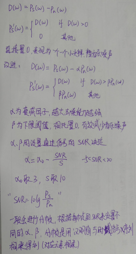 多了两个参数alpha 和 beta。alpha称之为相减因子,它主要影响语音谱的失真程度,beta称之为频谱下限阈值参数,可以控制残留噪声的多少以及音乐噪声的大小。alpha>1,这样可以保证相比于之前的方法能够有更强的去噪效果,能够去除大部分的噪声,这样残余的噪声就会少很多。但是同样的相减后差值如果为负值,这个负值也就会更大。老方法中是将负值直接设为0,这样残余噪音的峰值和0之间的差值还是较为显著,所以Berouti就想了一个办法,就是设置一个语音的下限值beta* Pn(w)。将相减后的幅值小于此下限值得统一设置为这个固定值,这个下限值其实也是宽带的噪音,只不过设置下限值的好处是残余峰值相比之下没有那么显著,从而减小了“音乐噪声”的影响。可以通过调整beta的值来调整这个宽带的噪声的强度。