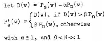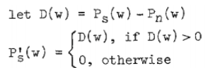 Ps(w)是输入的带噪语音的频谱,Pn(w)是估计出的噪音的频谱,两者相减得到D(w)差值频谱。由于相减后可能会出现负值,所以就简单粗暴地加上一个判断条件,将负值全部置为0,这样得到的结果作为最终输出去噪语音的频谱。