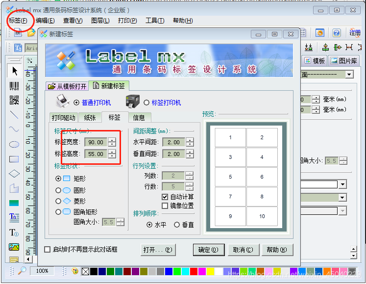 - 打开Labelmx条码标签打印系统,新建一个标签,尺寸跟实际标签纸张一致。