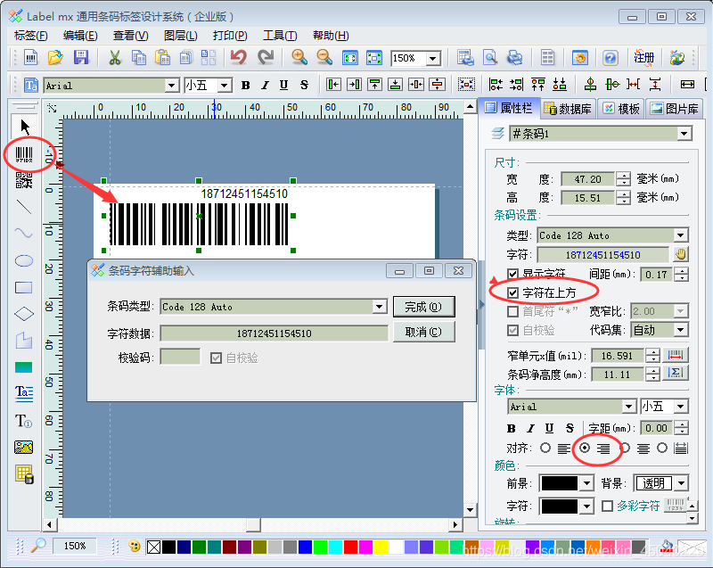 - 3.点击右侧的条码工具在页面中划一下,会出现一个条码,双击该条码,在弹出的“条码字符辅助输入”框里,选择条码类型,输入条码数据。在右侧属性栏中勾选“字符在上方”,字体对其方式选择右对齐,生成如下图所示的条码。
