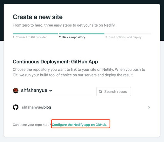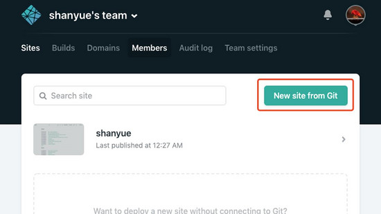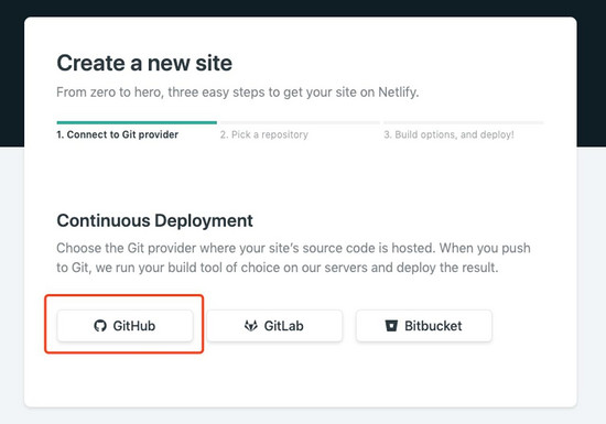 使用 github 授权登录 netlify 。在主页点击 New site from git 按钮,新建站点