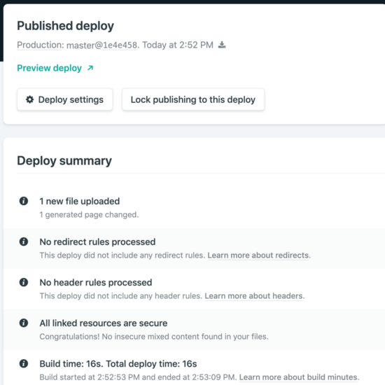 CI/CD: 当你 push 代码到仓库的特定分支会自动部署http headers: 你可以定制资源的http header,从而可以做 缓存优化 等http redirect/rewrite: 如果一个nginx,这样可以配置/api,解决跨域问题二级域名: 你如果没有自己的域名,可以使用它的任意二级域名-只要没有被占用,这比github page多仓库只能用/path要好很多CDN: 把你的静态资源推到 CDN,虽然是国外的https: 为你准备证书,当然使用的是lets encryptPrerender: 结合SPA,做预渲染