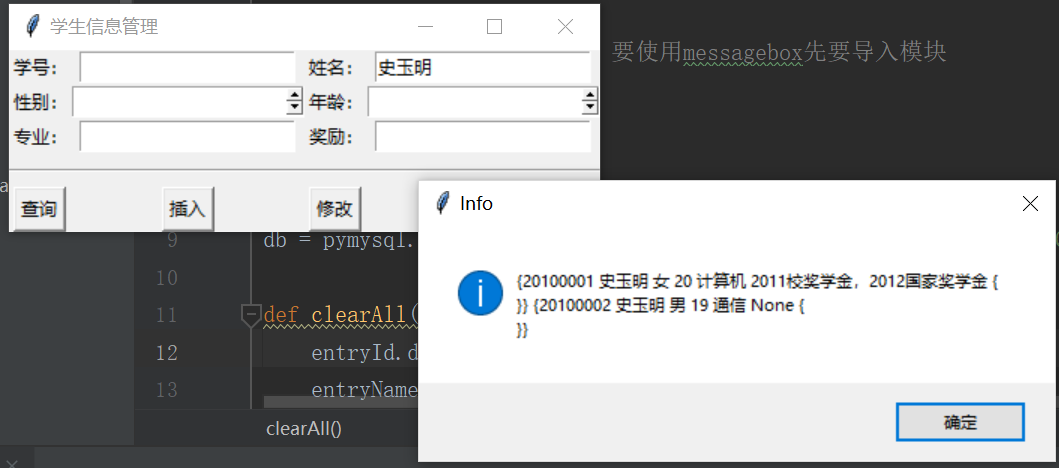 db = pymysql.Connect(host = "127.0.0.1", user = "root", passwd = "QAZwsxedc123@", db = "elective", port = 3306, charset ='utf8') #括号内的“db =”虽然此处标为数据库名称,但实际为模式(SCHEMA)名称def clearAll():entryId.delete(0, 'end')entryName.delete(0, 'end')entryMaj.delete(0, 'end')entryRew.delete(0, 'end')spinboxSex.delete(0, 'end')spinboxAge.delete(0, 'end')def search():cursor = db.cursor()name = entryName.get()id = entryId.get()if(id != ''):try:id = int(id)sql1 = "select * from {} where Sno = {}".format(table1, id)cursor.execute(sql1)a = cursor.fetchone()if(a != None): #此处将a换为cursor.fetchone()不行。原因待日后补充list1 = []for value in a:print(value)list1.append(value)sql2 = "select Srew from {} where Sno = {}".format(table2, id)cursor.execute(sql2)list1.append(cursor.fetchone()[0])tk.messagebox.showinfo(title='Info', message=tuple(list1))else:tk.messagebox.showerror(title='错误!', message='查无此人!请重新输入!')except:tk.messagebox.showerror(title='错误!', message='输入错误!请重新输入!')elif(id == '' and name != ""):sql1 = "select * from {} where Sname = \"{}\"".format(table1, name)cursor.execute(sql1)a = cursor.fetchall()if (a != ()): #如果未查询到结果,返回一个空元组()list1 = []for value in a:value = list(value)list1.append([*value])sql2 = "select Srew from {} where Sname = \"{}\"".format(table2, name)cursor.execute(sql2)i = 0for value in cursor.fetchall():value = list(value)list1[i].append(value[-1])list1[i].append('\n')i += 1tk.messagebox.showinfo(title='Info', message = list1)else:tk.messagebox.showerror(title='错误!', message='查无此人!请重新输入!')clearAll()cursor.close()