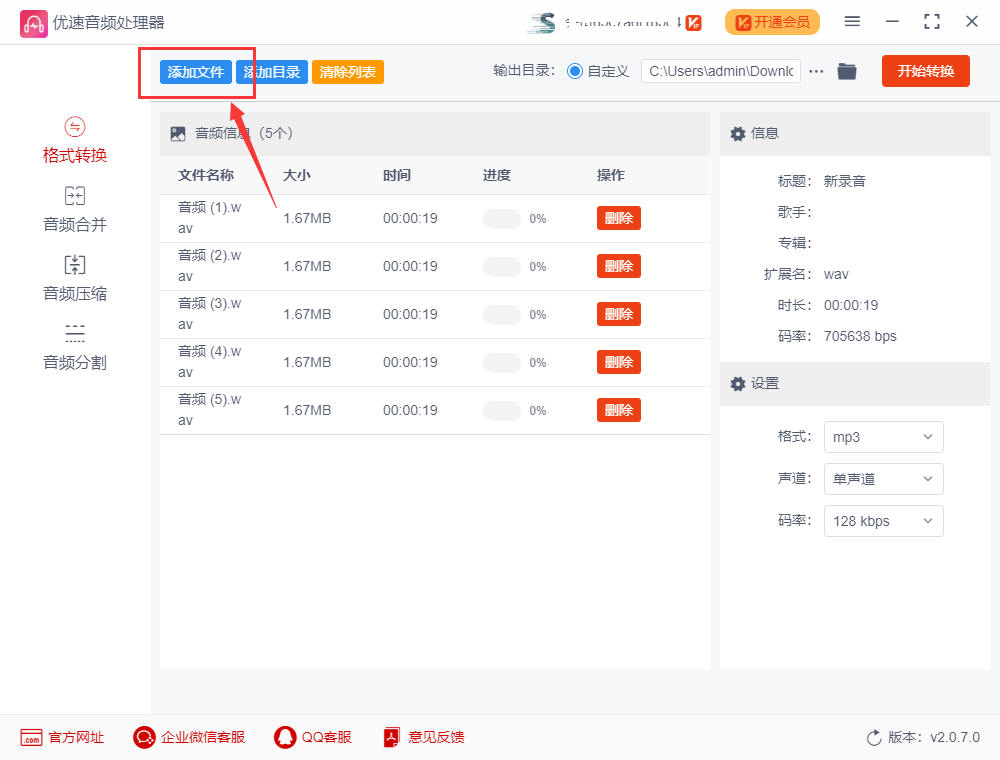 2、用户点击【添加文件】蓝色按钮,把需要转换的wav音频文件添加到软件中,有多个文件时就批量添加文件夹,无需单独操作,软件支持批量转换。