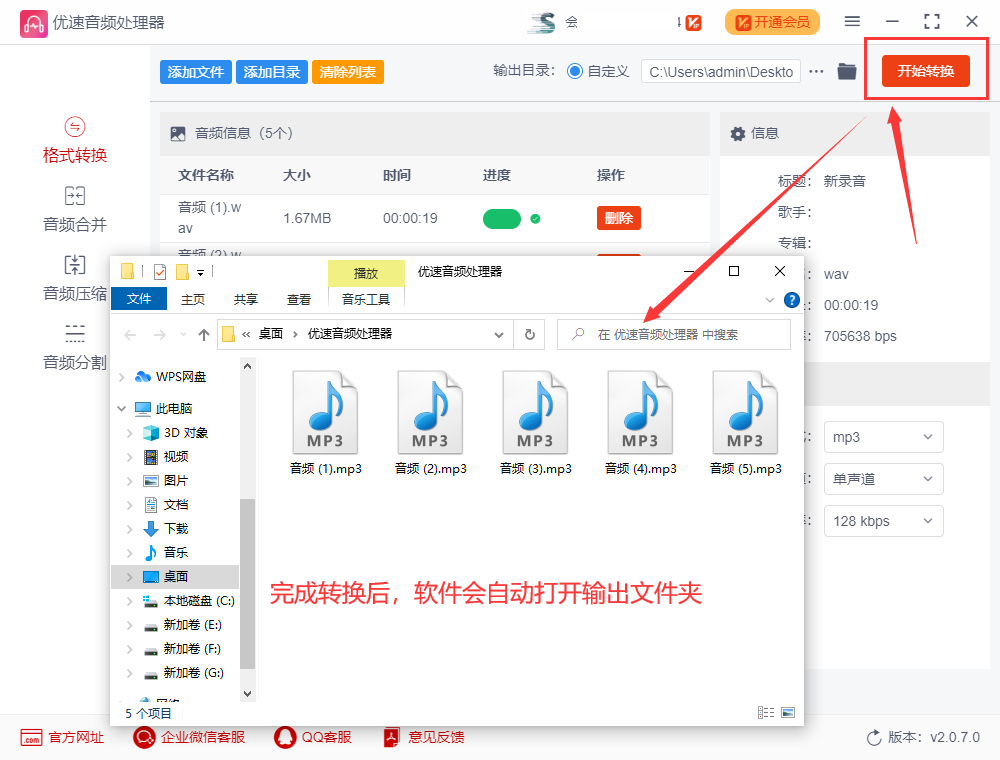 4、上述准备就绪后,用户此时可以点击右上角【开始转换】红色按钮,启动软件程序。稍等片刻,软件会自动弹出打开输出文件夹,此时转换结束,转换好的MP3文件就保存在此。