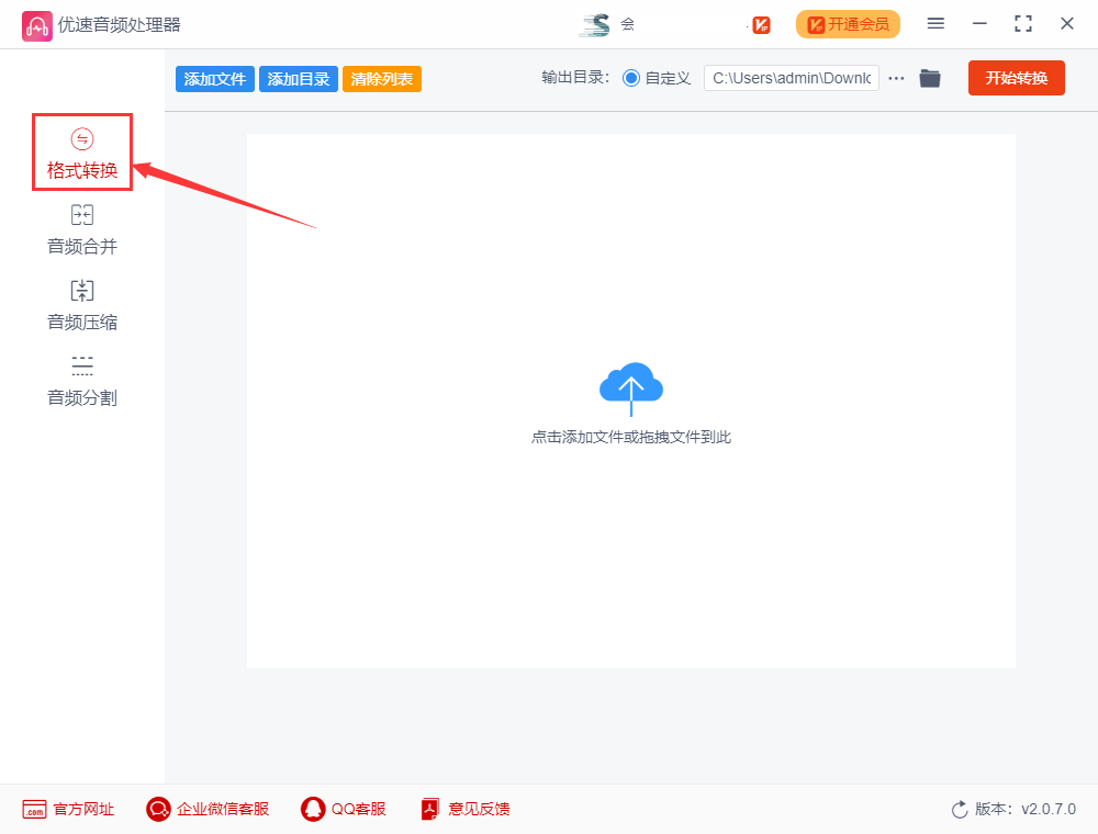 1、用户需要把软件“优速音频处理器”下载安装到电脑上,安装成功后打开软件。在左列表的四个功能中选择【格式转换】功能。