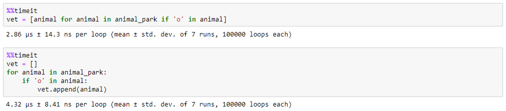 另外非常重要的一点是,列表推导式的速度非常快。如下两者都加了条件语句,但是列表推导式要比一般的循环语句快了 51%。