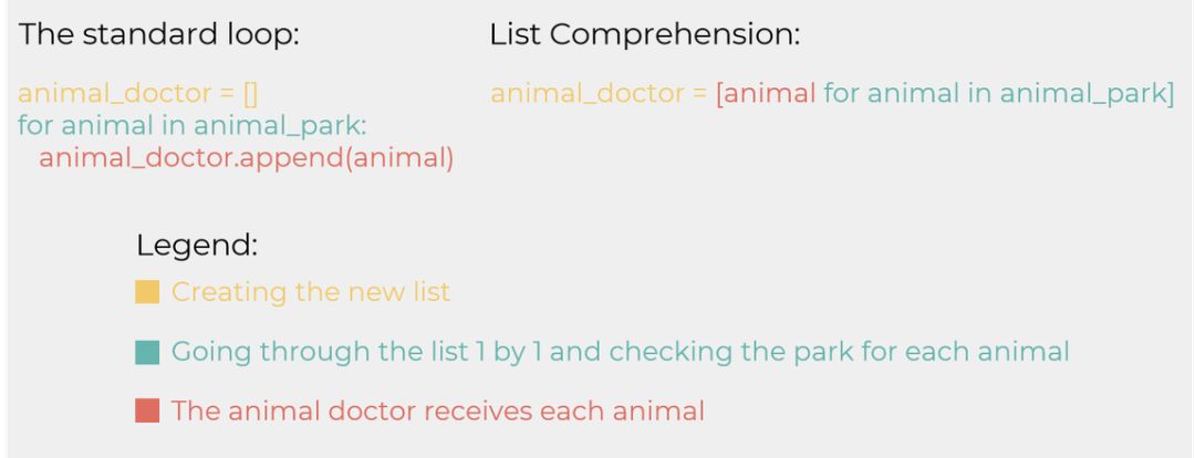 通过列表推导式,我们将代码量由三行降低到一行。如果对比两者,我们会发现它们其实是一样的,差不多都是创建、遍历和接收三部分。