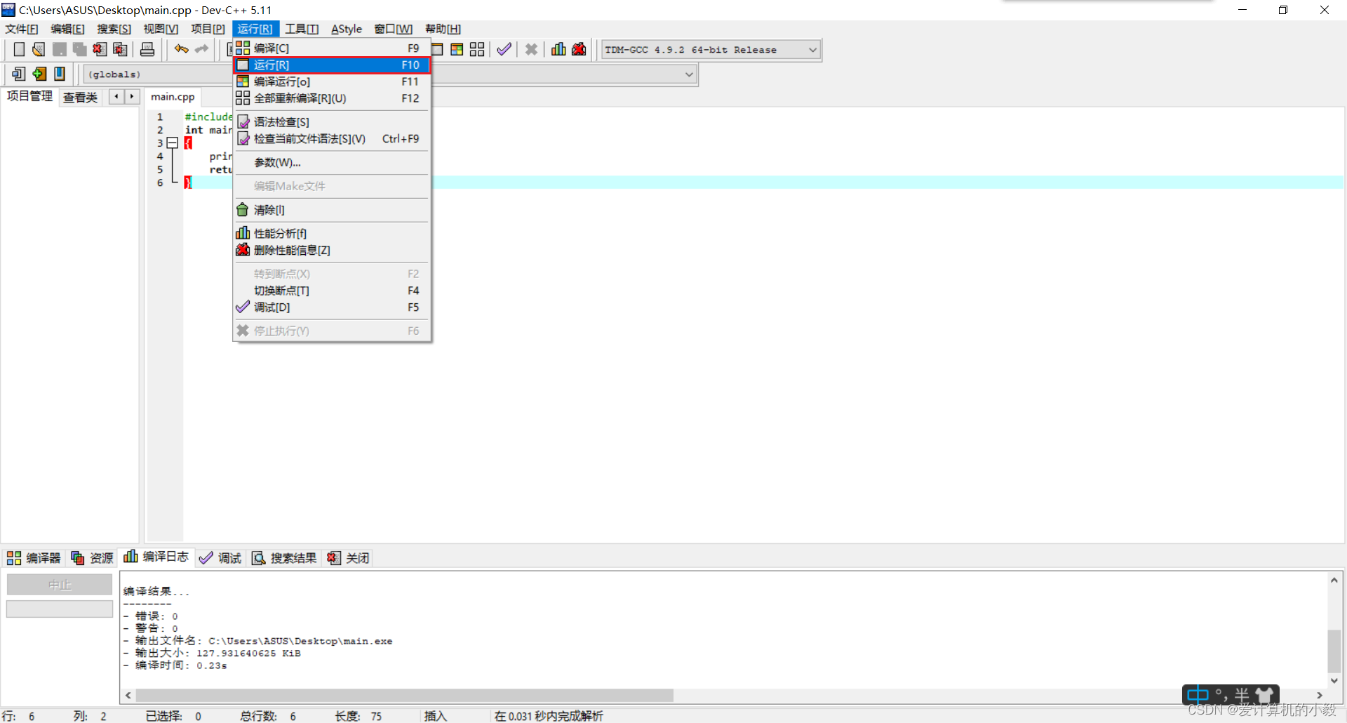 第五步:编译结果错误为0,继续单击运行选择运行输出hellword!,到这里环境变量和编辑器全部配置完成