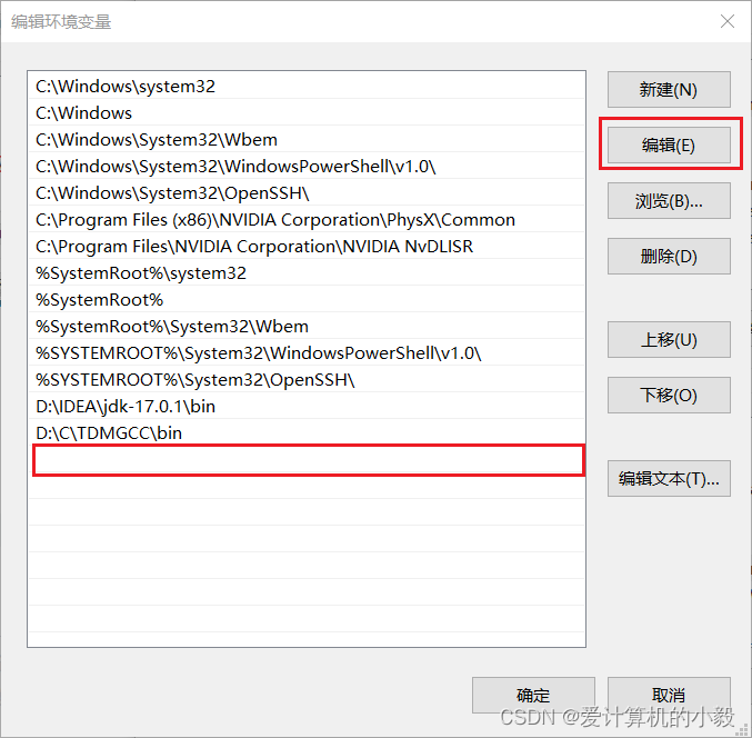 第六步 单击编辑在空白处粘贴刚刚复制的路径(也可以按浏览选择刚刚的路径一定要选择到bin的路径)到这里环境变量已经配置完成了