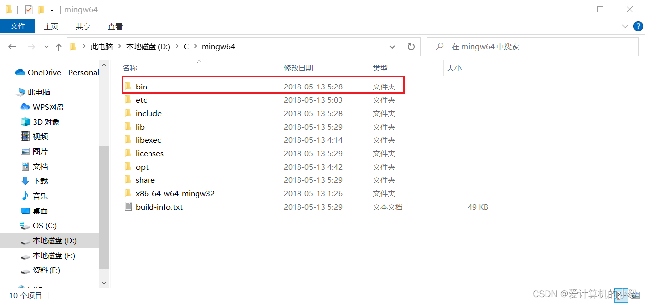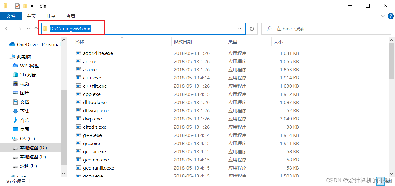 第一步 打开minggw文件夹里的bin文件(这边我已经安装过了是存在了D盘里)