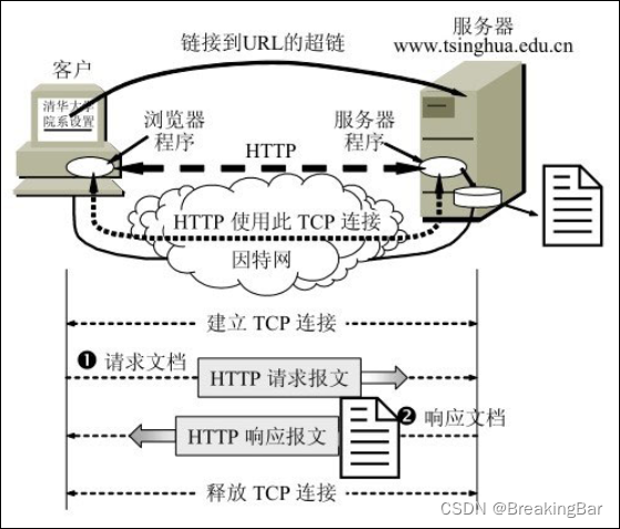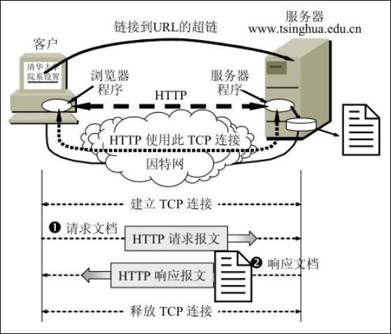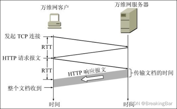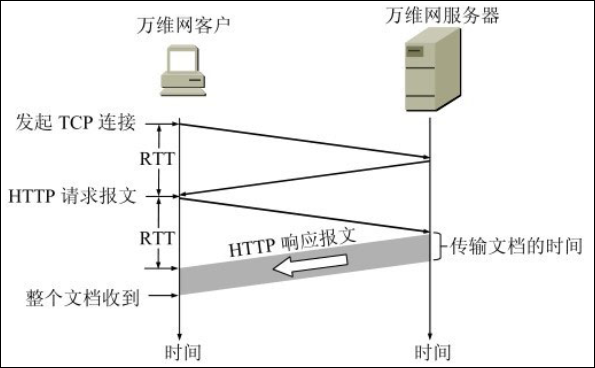 从图中可以看出,请求一个一个万维网文档所需的时间是该文档的传输时间(与文档大小成正比)加上两倍往返时间RTT(一个RTT用于连接TCP连接,另一个RTT用于请求和接收万维网文档。这里TCP建立连接的三次握手的第三个报文段中捎带了客户对万维网文档的请求)。