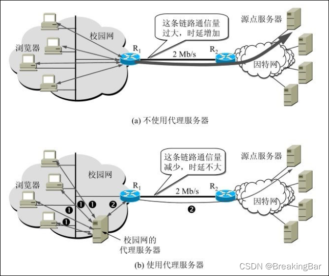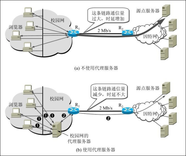 代理服务器(proxy server)是一种网络实体,它又称为万维网高速缓存(Webcache)。代理服务器把最近的一些请求和响应暂存在本地磁盘中。当新请求到达时,若代理服务器发现这个请求与暂时存放的请求相同,就返回暂存的响应,而不需要按URL的地址再次去因特网访问该资源。代理服务器可在客户端或服务器端工作,也可在中间系统上工作。下面我们用例子说明它的作用。