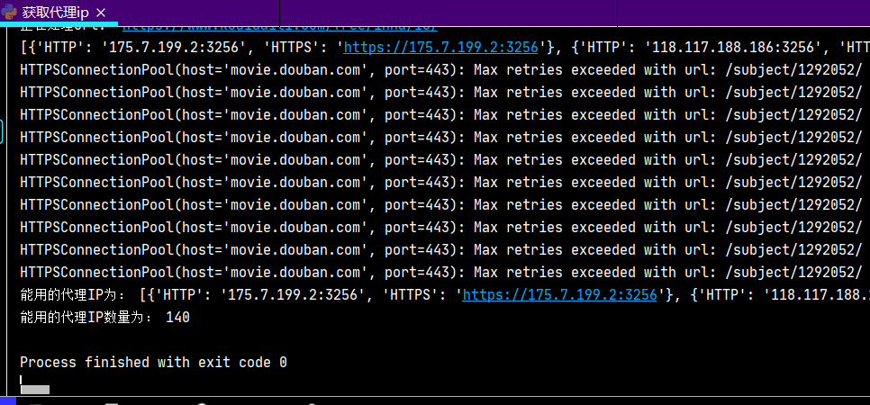 def check_ip(list_ip):headers = {'User-Agent': 'Mozilla/5.0 (Windows NT 10.0; Win64; x64) AppleWebKit/537.36 (KHTML, like Gecko) Chrome/91.0.4472.164 Safari/537.36 Edg/91.0.864.71','Connection': 'close'}# url = 'https://www.baidu.com' # 以百度为例,检测IP的可行性url = 'https://movie.douban.com/subject/1292052/'can_use = []for ip in list_ip:try:response = requests.get(url=url,headers=headers,proxies=ip,timeout=3) # 在0.1秒之内请求百度的服务器if response.status_code == 200:can_use.append(ip)except Exception as e:print(e)return can_usecan_use = check_ip(list_headers_ip)