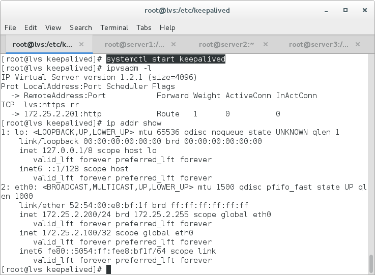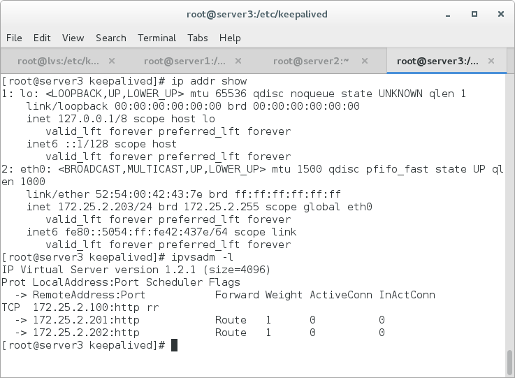 ip addr add 172.25.2.100/24 dev eth0 #配置VIP(由于是DR模式,所以三个都需要配置)