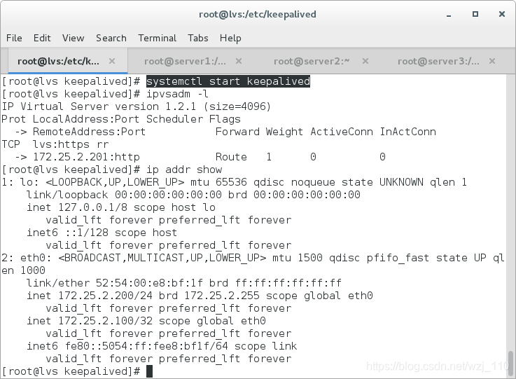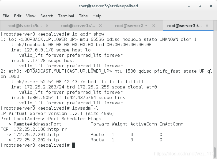 virtual_server 172.25.2.100 80 {delay_loop 6 # 当rs报错时候,尝试多少次之后才会发送邮件告知!lb_algo rr # 负载均衡的算法(10种)lb_kind DR # 默认时NAT模式(这里选择DR)#persistence_timeout 50 #注释(保持连接的时间)protocol TCPreal_server 172.25.2.201 80 {TCP_CHECK {connect_port 80weight 1connect_timeout 3}}real_server 172.25.2.202 80 {TCP_CHECK {connect_port 80weight 1connect_timeout 3}}