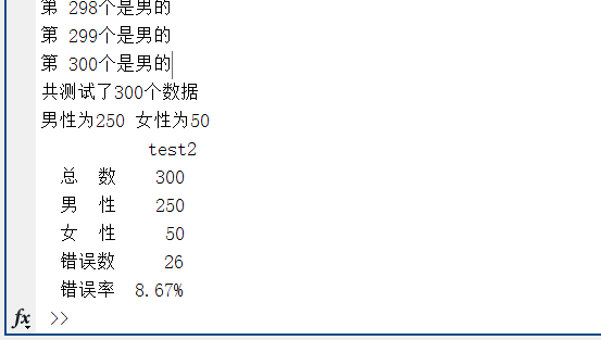 fprintf('共测试了%d个数据\r男性为%d 女性为%d\r',length(man_woman),num_man,num_woman)
