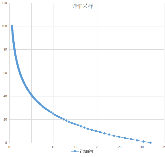 根据需求,我这测试只用选取0~100度区间就OK了.也就是100个点 , 用表格绘制曲线图.Y轴是温度,X轴是电阻值,单位KΩ.这是一个非线性曲线,所以我们很难求解. 所以不如把它划分成多个区间,每个区间都是一小段直线.