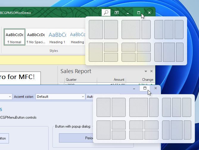 新版本为所有视觉主题实现了Windows 11 Snap Layout(见屏幕截图),您无需对应用程序源代码进行任何更改:当程序在 Windows 11 操作系统中运行并且悬停最大化/恢复字幕按钮时,该按钮附近会出现布局弹出菜单。
