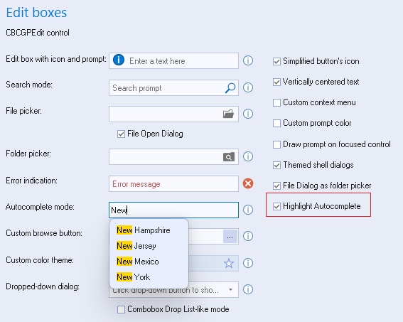 4. CBCGPEdit:现在可以在自动完成下拉列表中突出显示输入的文本(参见屏幕截图),调用新方法 SetAutoCompleteListHighlightedColors 来启用此功能。