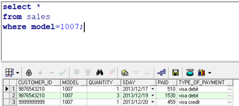 ) ;INSERT INTO sales (customer_id, model, quantity, sday, paid, type_of_payment) VALUES ('1122334455', '2010', 1, to_date('2013-12-19','yyyy-MM-dd'), 2300, 'mastercard credit');